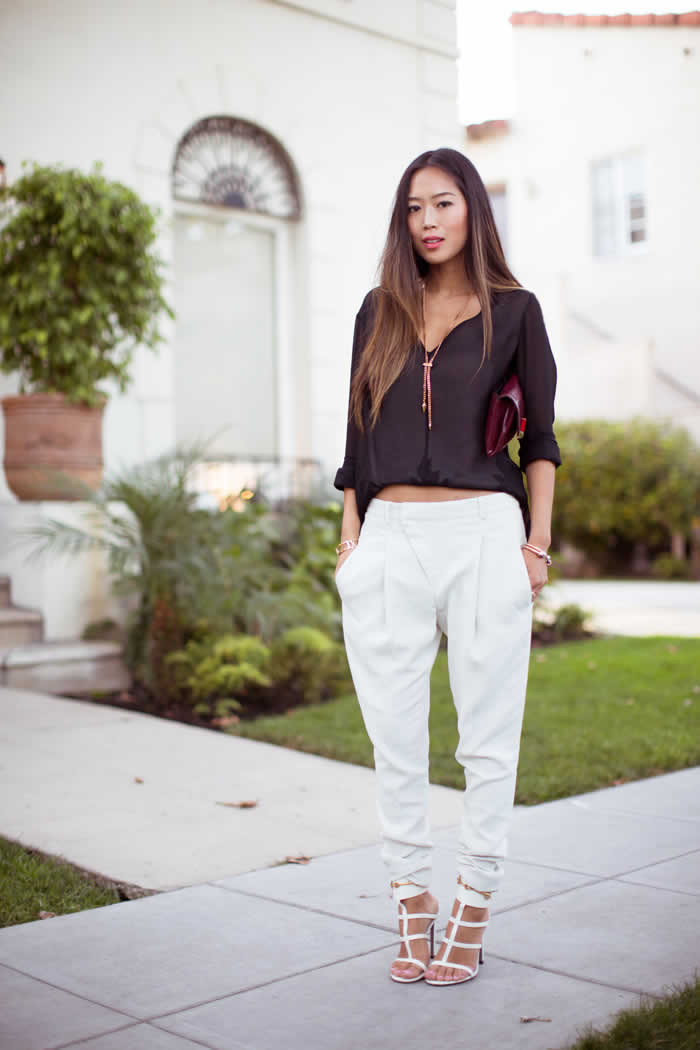 #5- White baggy harem pants with matching white cage heels. Finish this outfit with contrasting black silk look top and add a splash of colour with a burgandy clutch bag.