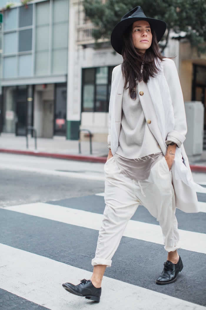 #4- The all white, tomboy look with baggy, rolled up trousers and coat. Contrast this look with matching black fedora style hat and black brogues.You can also have a hispter style fashion with this.