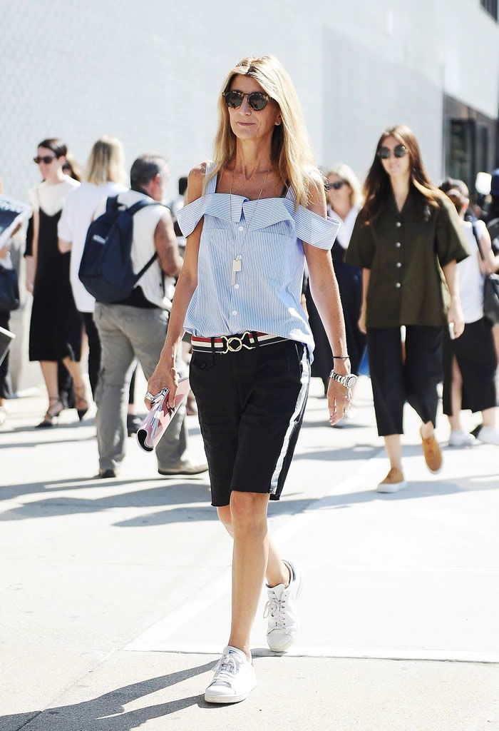 Give your slouchy bermuda shorts a luxe touch with a statement belt and cold-shoulder top.