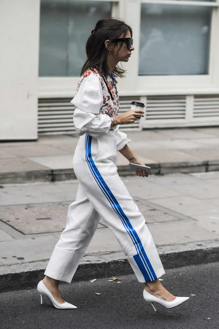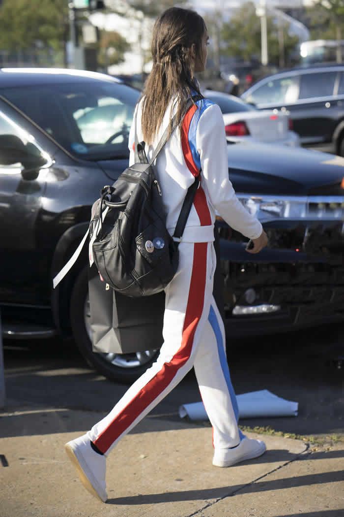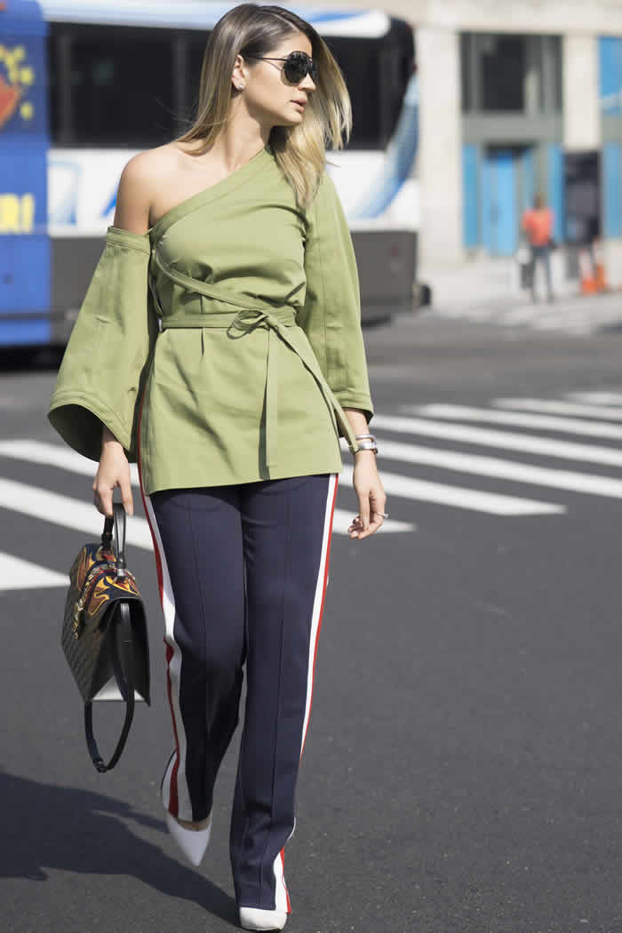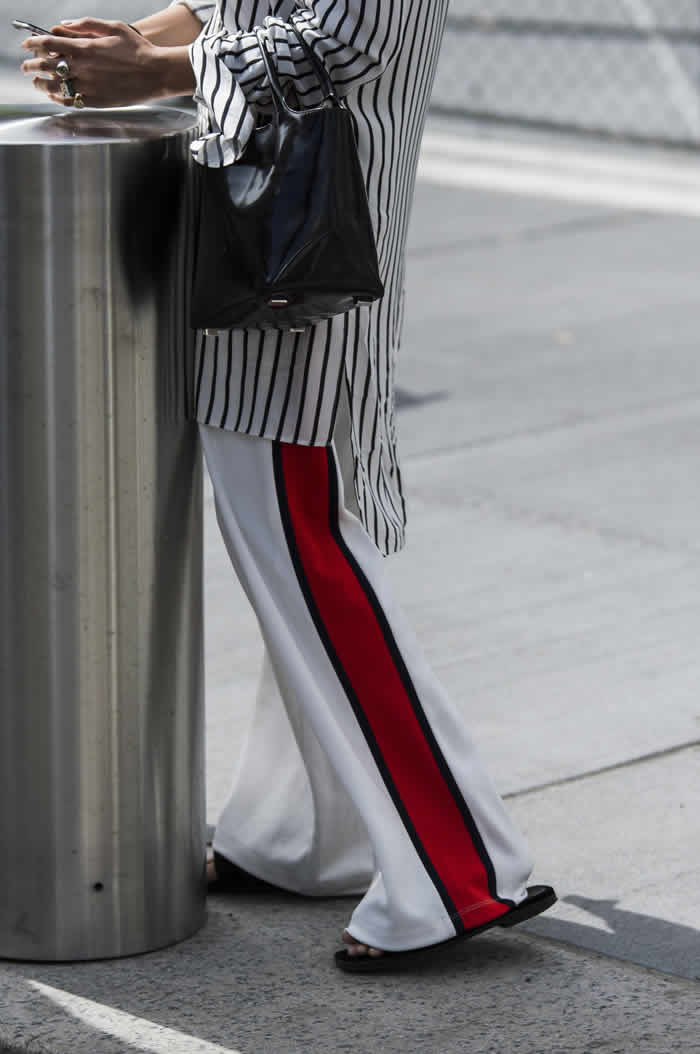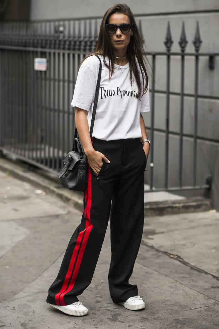 This season at Fashion Week, we’re seeing ladies rock their gym pants with heels and undone blouses. They’re slipping into full sets, and breaking up their look with a statement bag. And they’re almost always adding a feminine touch in the form of jewelry: chunky chokers, geometric earrings, and fistfuls of rings included. Read on for a few different styling tricks we gathered from the street, then shop the essential piece that’s comfortable (and now chic) enough to live in.