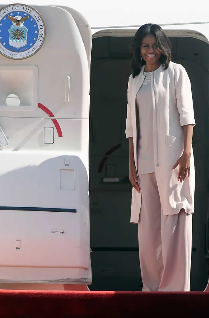 Michelle Obama wearing a Duro Olowu skirt at Malpensa Airport.