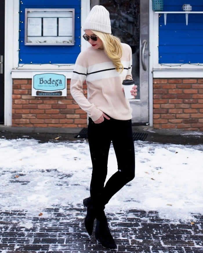 You may feel yourself slipping into a black-pants rut in the dead of winter, but your legs can come out to play. Like fashion blogger Blair Eadie, you may resort to a pair of black tights that can define your legs while keeping you warm. Also, tall, thin socks will fit inside your flats, saving you money by allowing you to continue to wear those comfortable shoes all year. On milder days, have some fun and flaunt your legs with over-the-knee boots.