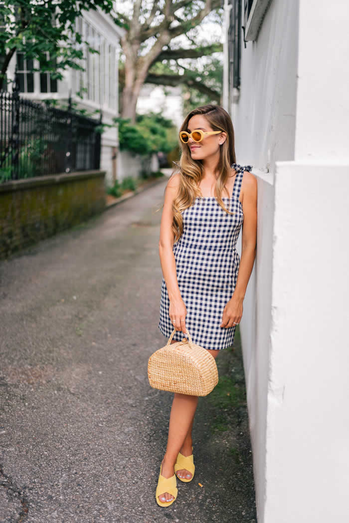 3. Checkered Dress + Straw Purse