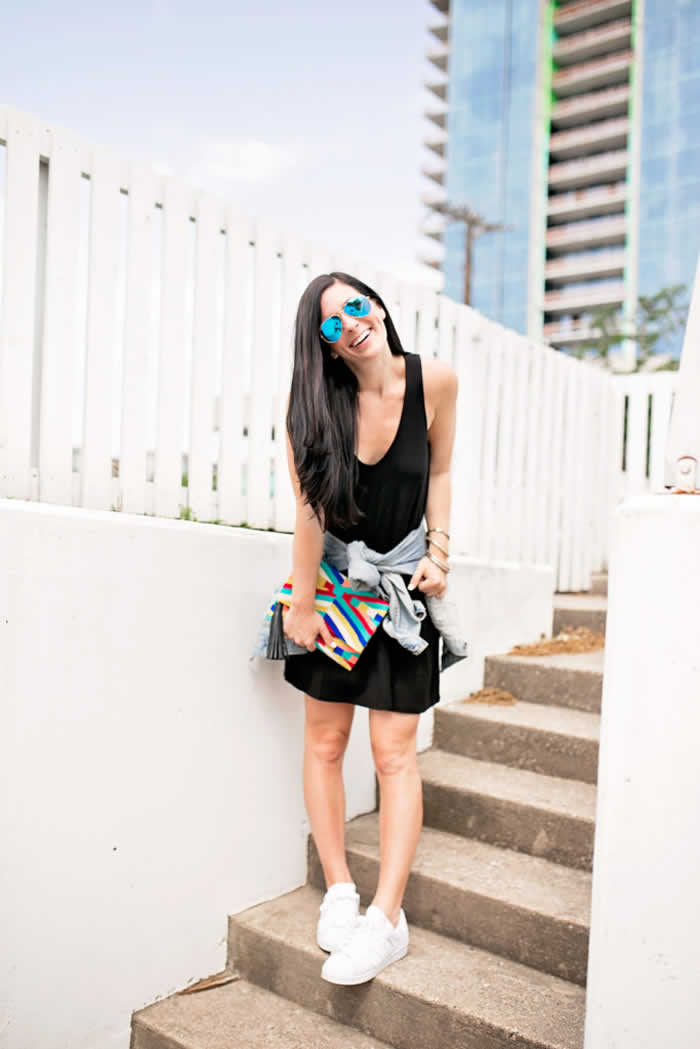 Pull off looking casual and trendy this summer with a simple tank top dress and clean white sneakers – turn it up a notch by wrapping a denim jacket around your waist. If you want a burst of color, add a bold clutch and make this your best outfit yet!