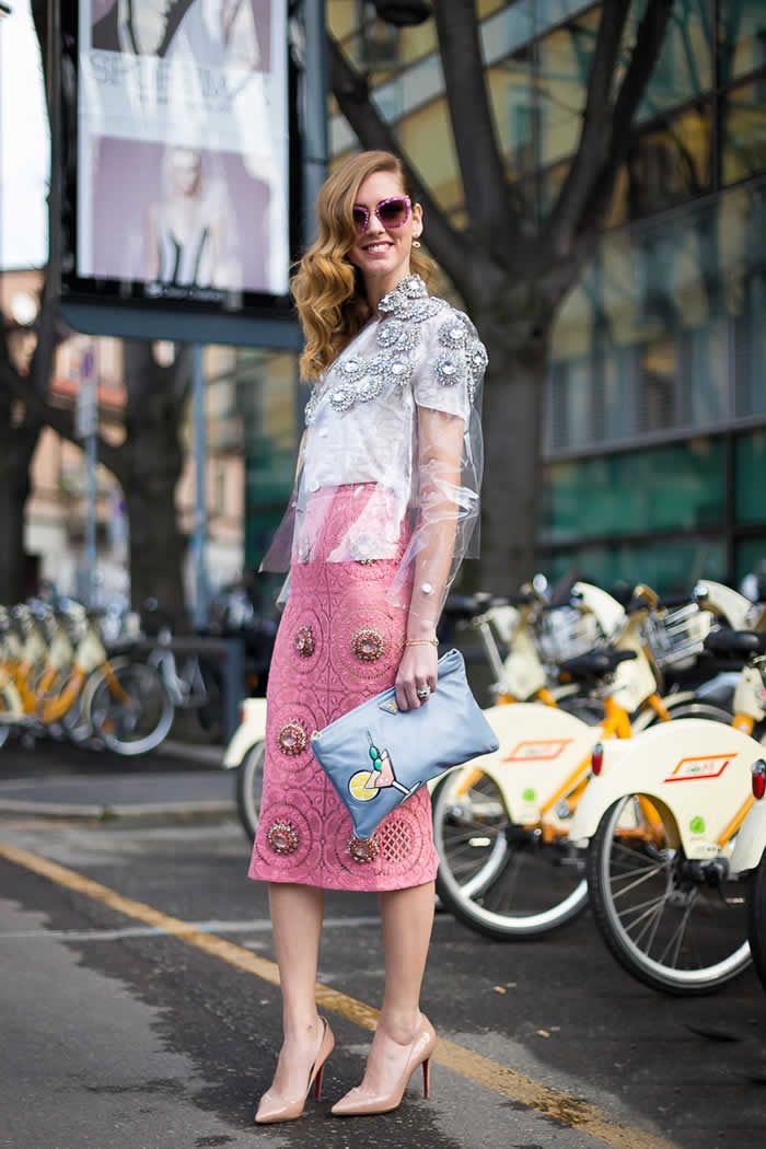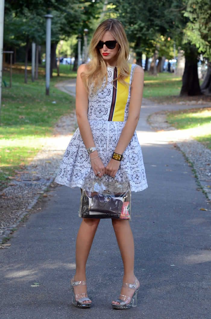 The easiest way to pull off transparency without abandoning all modesty is to experiment with layers. Like fashion blogger Kristina Bazan, you may opt for a plain white dress and a pair of orange heels that will pop against a transparent coat. Just keep the look modern by juxtaposing your sheer fabrics with weightier pieces like leather leggings, cotton tees, and structured jackets. Or like street style star Chiara Ferragni, opt for transparent toppers with embellishments that look more fashion-forward and chic.