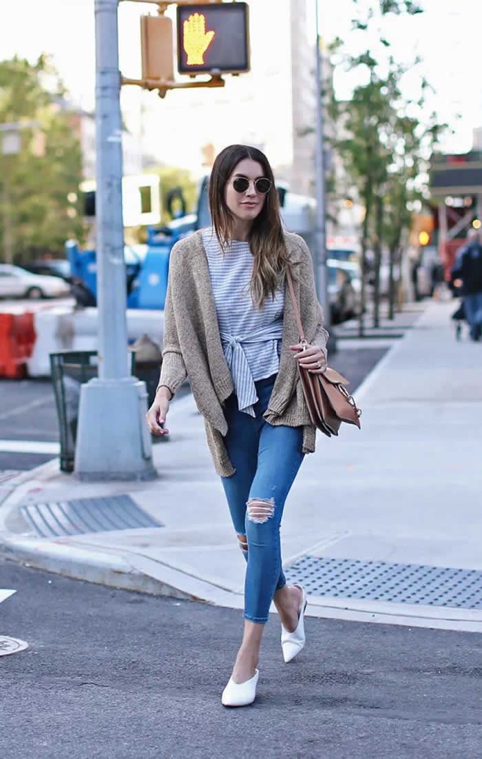A tie-front top with a cardigan, jeans, and a statement bag.