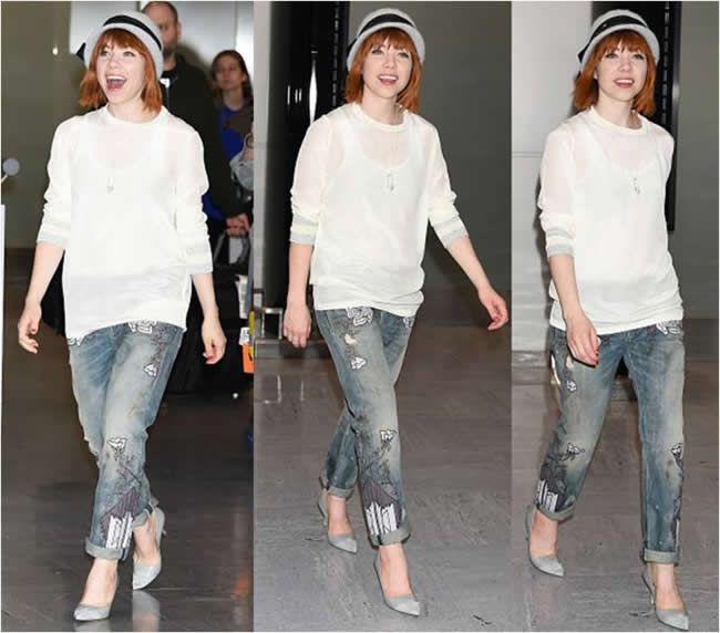 Carly Rae Jepsen was photographed wearing Cynthia Rowley and Carlo Pazolini shoes in Toyko today! The singer made a chic arrival in her Cynthia Rowley Long Sleeve Silk Rib Cuff Tee that she paired with Carlo Pazolini’s Grey Suede and Leather Pumps.