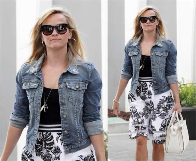 Reese Witherspoon was photographed wearing Fidelity Denim today in Los Angeles! The blonde beauty paired the Ryder jacket in Exile Destruct with her floral sundress for a flirty Spring look.
