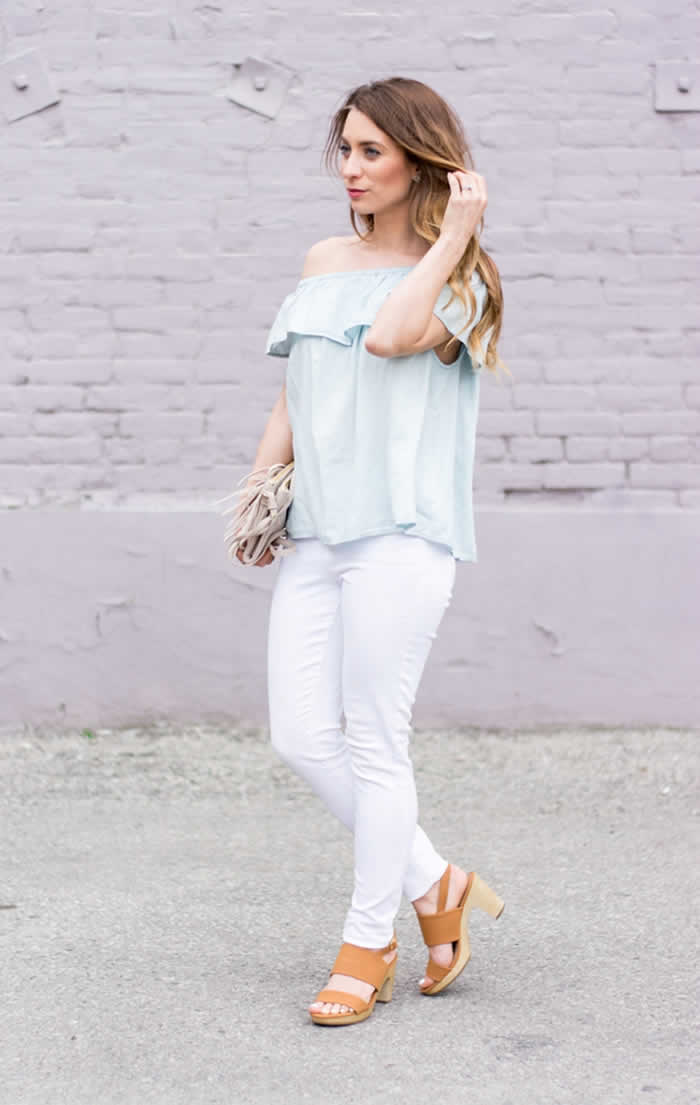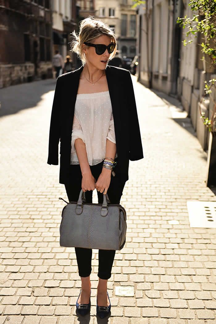 Like fashion blogger Sofie Valkiers, bring some breezy vibe to your office looks by resorting to an off-shoulder top paired with straight-leg pants, but top it with a chic office blazer to make them work for your workplace then take it off after office hours. Or, wear your chic summer whites in your creative workplace, but add a hint of summer by adding some pop of color with your shoes and bag like Sofie Valkiers did.