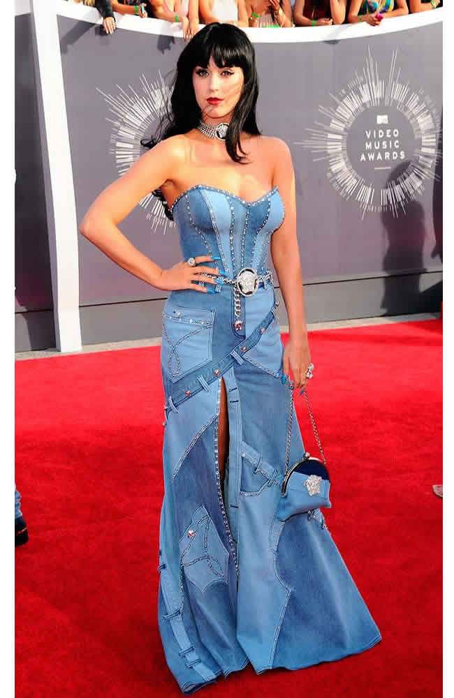 Katy Perry attends the MTV Music Awards in LA wearing a Versace denim dress, August 2014.