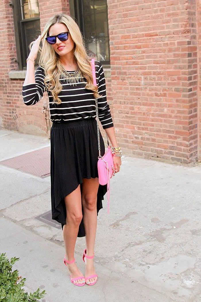 If you don’t want to risk going over the top with your hi low skirt, you can always pair it up with your everyday basics like a plain tee or a button up shirt. This combo makes for a fun everyday outfit idea. You can also dress it up just a bit more by adding layers.
