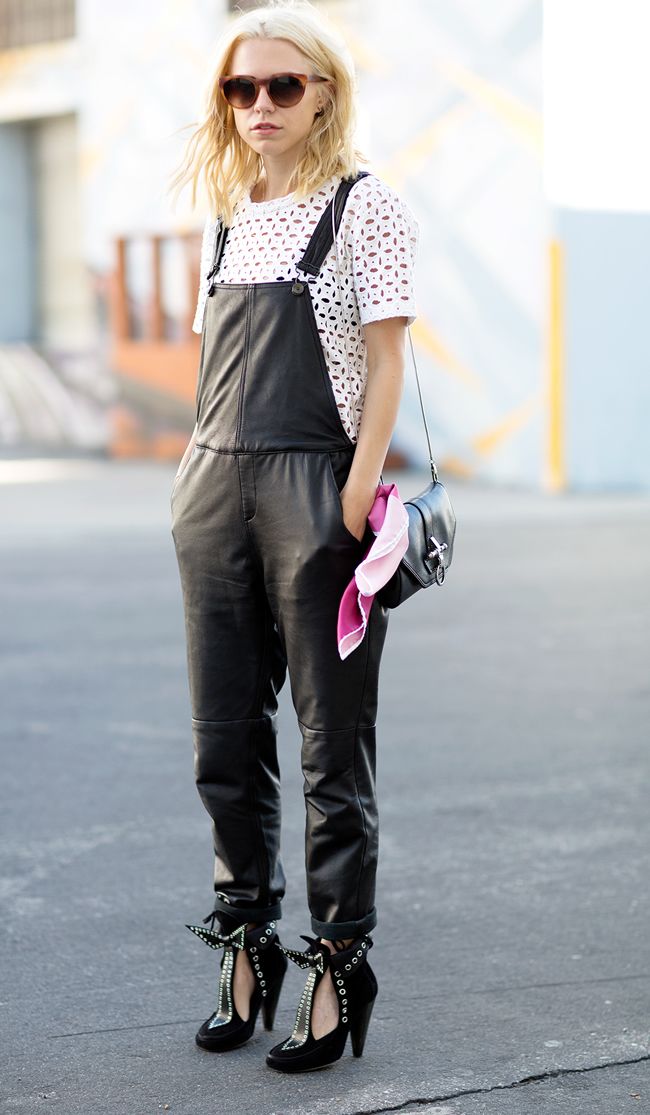 The latest fashion trends are hugely appreciating overalls other than the traditional denim ones. Grace up your look with a chic and grungy leather overalls. As a matter of fact, the leather overalls are undeniably the coolest version of the formerly 90’s fashion trend. Style up yourself in a black leather overall and pair it up with a white sweater and black leather heeled boots. Put a cherry on the top by layering it up with a deep colored coat. If real leather is out of your budget, you can try this grunge-chic look with the less pricey faux leather overall.