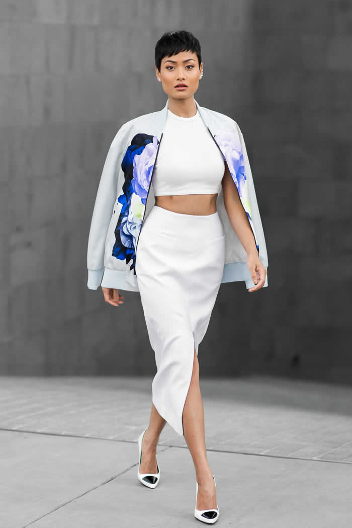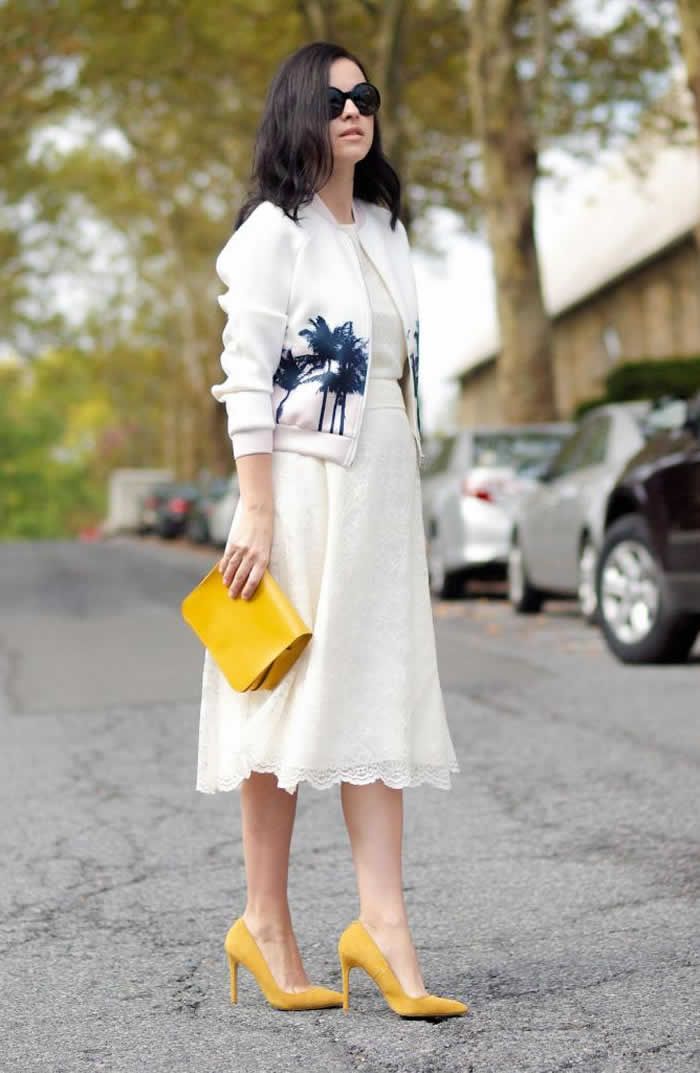Like fashion blogger Veronica Popoiacu, top your white dress with a white printed bomber jacket to keep you season-appropriate while wearing mustard shoes and yellow clutch keeps your outfit vibrant and chic.
