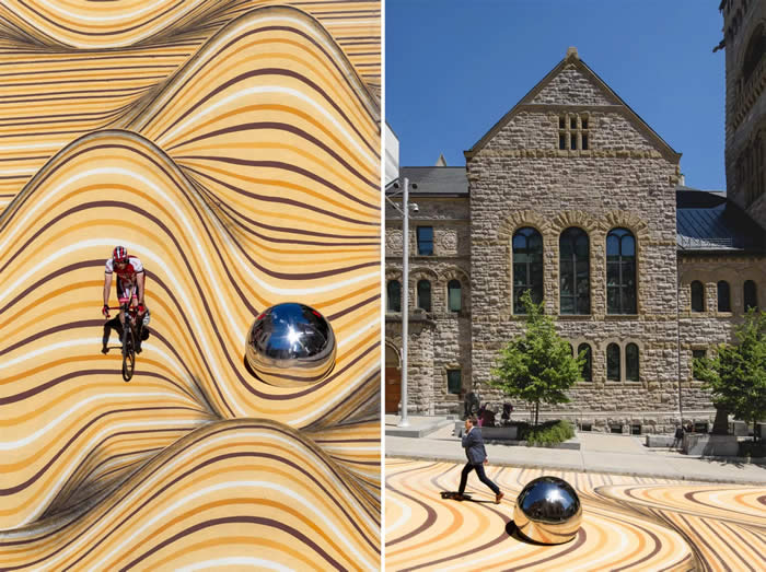 Chrome spheres appear sporadically along the street to reflect the surrounding architecture and the undulating patterns of the ground.