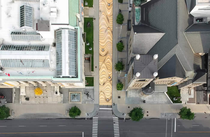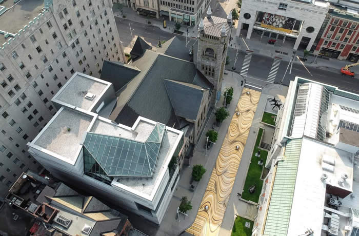 Aptly named “Dunes in motion”, this anamorphic work is composed of beige lines that undulate along the promenade, creating a path of visual illusion imitating scenarios of deserts and beaches.