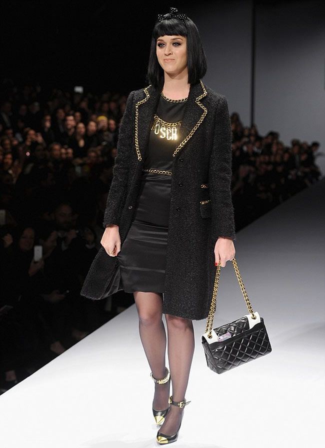 Milan Fashion Week 2014 – don’t you just love this black and gold outfit Katy wore to Milan Fashion Week? This black and gold number is by Moschino and it has a very subtle goth-y look and feel to it but it also has that chic, It Girl vibe to it.