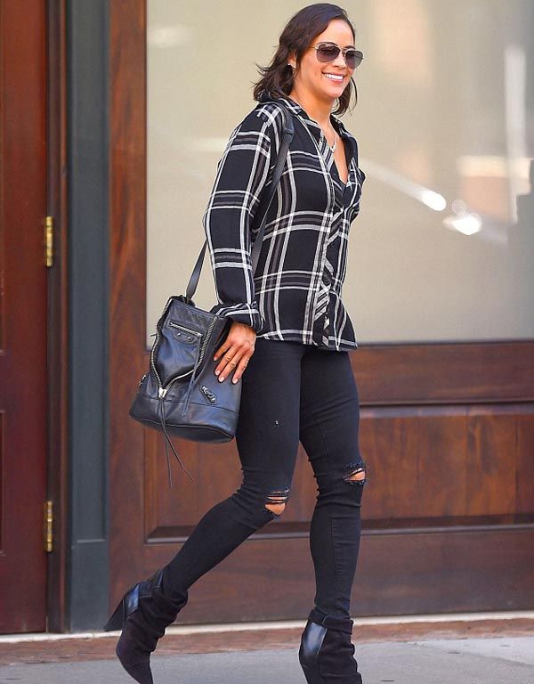 The 38-year-old looked relaxed as she showed off her shapely toned legs in a pair of skintight ripped jeans while strolling through the Tribeca neighbourhood. She teamed the jeans with a bold black and white checked shirt and donned pointed suede ankle boots.