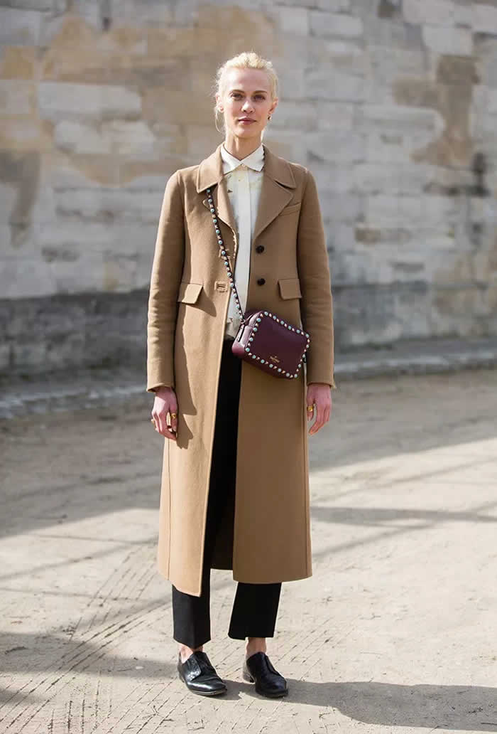 Take a few cues from menswear a shirt buttoned all the way up, polished brogues, and a camel coat and you’ll no doubt look better than most of the boys at work.