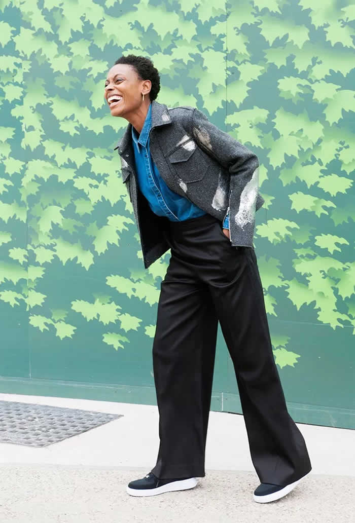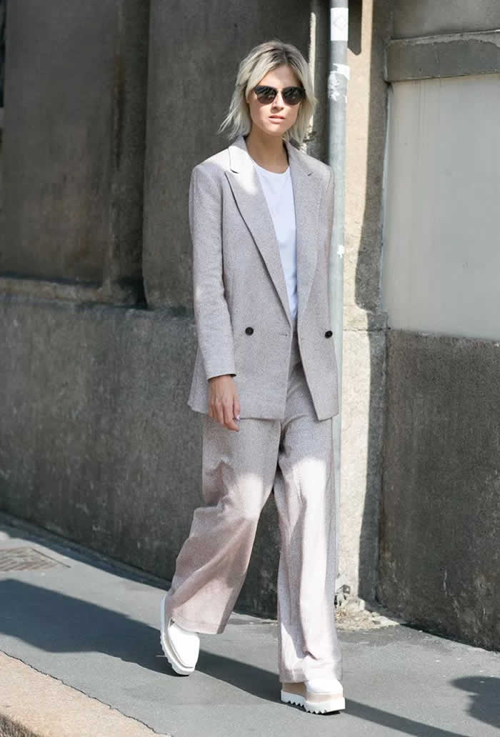 Don’t you wish you looked this happy on a Monday morning? Yeah, us too. But while drumming up enthusiasm for client meetings and conference calls may take more than a cute outfit, it certainly can’t hurt. The denim shirt and sneakers seem casual on their own, but paired with a boxy, boyish jacket and wide-leg pants, they’re dressed-up enough for the office.