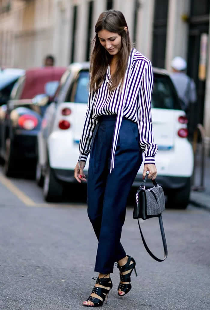 How to nail the elusive French Girl Look for your 9-to-5: cropped navy trousers, a striped silk blouse, and a pair of vertiginous heels.