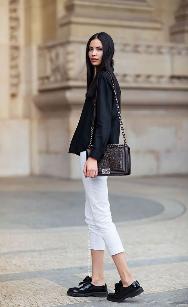 White on top and black bottom (or vice versa) – one of the most popular and easiest way to wear black and white is to pick out a white top and wear it with a pair of black bottoms (pants, skirt, shorts, whatever you like). This is an outfit combo that you can wear anywhere from a date to the office to the bar. You can also do the reverse if you like.
