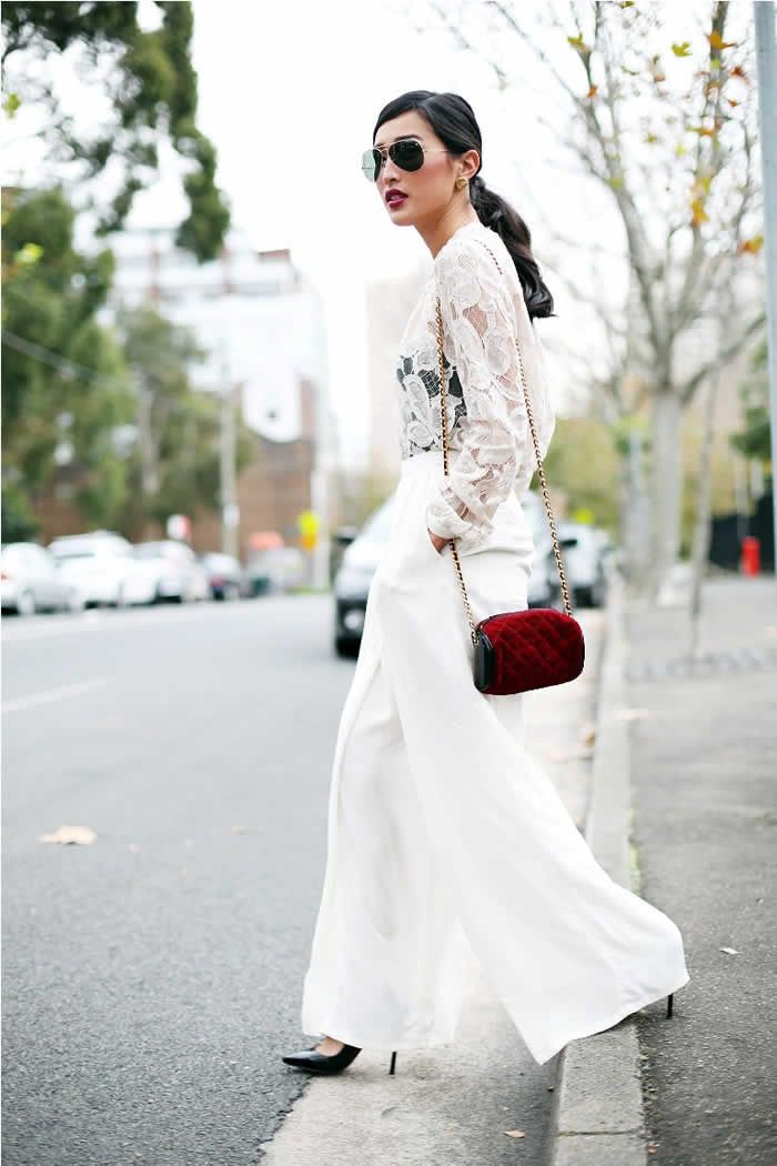 However, only go for a tailored and dressy style rather than business like. Like fashion blogger Nicole Warne, you can also opt for dressy trousers with your lace top, being sure to select a dressy style appropriate for the occasion.