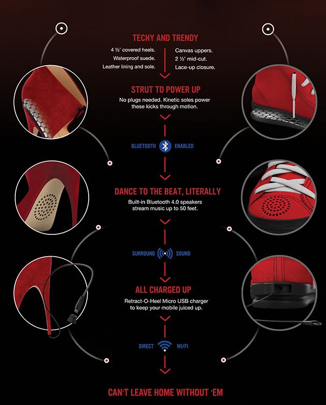 An equal marriage of fashion and function, SmartKicks will be available in two red, standard-sized designs: SmartSneak and Smart-letto. Answering the age-old question, “What the hell do I do with my phone at the gym?” the SmartSneak is the perfect lace-up for working out, running errands, and fashionistas who like a more sportswear-inspired look. They feature canvas uppers, built-in Bluetooth, a rubber sole lugged to provide traction, and kinetic in-soles that allow you to charge through motion (Read: the future is amazing) so that you can stay connected no matter how long you’re away from a plug.