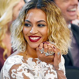 The stunning mother-of-one – who left her two-year-old daughter Blue Ivy at home during the event on Sunday night (26.1.14) – accessorised her white lace gown with chandelier earrings and statement cocktail rings on each finger of her right hand. On her left hand she added just one diamond-shaped cocktail ring to go with her 18-carat engagement ring.