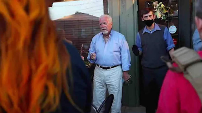 In the clip, one of the protesters can be heard hollering at the man, “You’re not the only one with a gun!” Indeed, a pair of men armed with rifles and handguns who appeared to be acting as security for the protesters were seen facing down the white-haired patron and arguing with him.