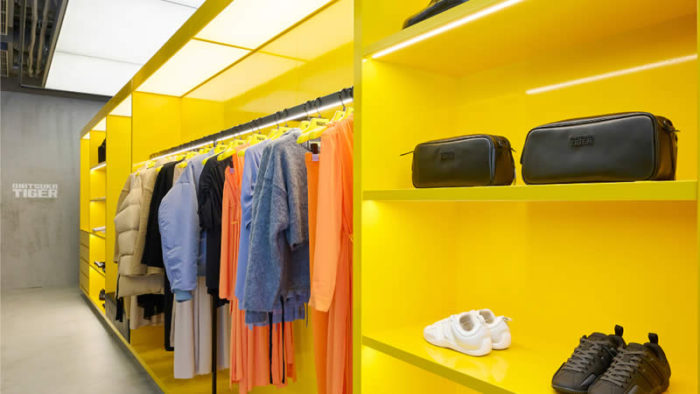 Ginza’s new spot is awash in the line’s hallmark ‘Tiger Yellow’ and black hues, coupled with a revamped logo flaunting bold typography. Designed to stand out, the store’s facade sports a stucco plaster finish, offering varied looks depending on the viewer’s perspective. Intriguingly, this plaster is set to gain a polished patina over time.