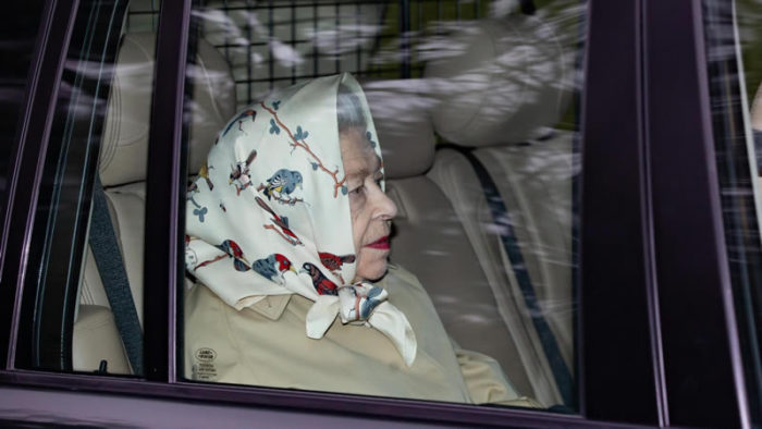 The Queen flew by helicopter from Windsor Castle on Sunday and was photographed in her car wearing vivid lipstick and a striking headscarf featuring garden birds.