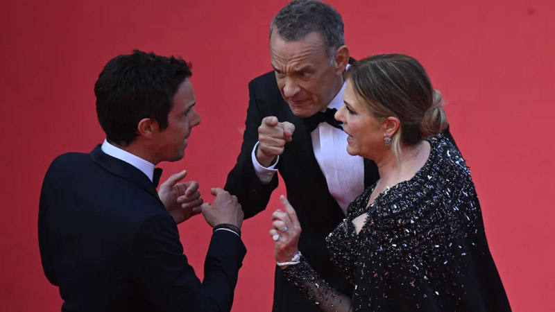 The details of the conversation remain unknown, but the man can be seen gesturing toward Hanks while the actor poses with his ‘Asteroid City co-stars on the red carpet.