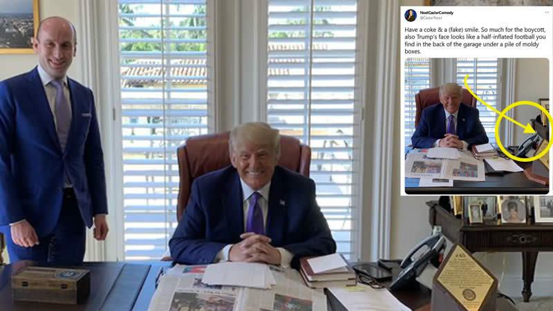 The first instance happened on April 5, when Trump’s senior advisor Stephen Miller posted a photo of his “terrific meeting” with the former president. A bottle of what appeared to be Diet Coke could be seen hiding (not very well) behind a phone on the desk Trump was sitting at.