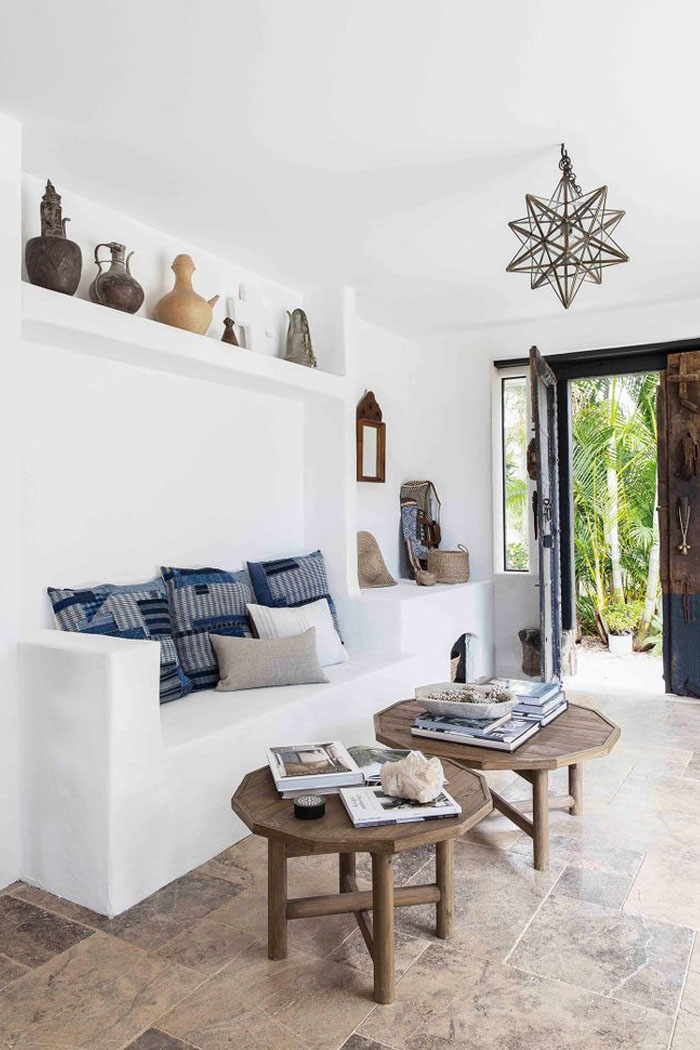 Whitewashed Mediterranean buildings inspired the gentle curves of flowing, formed concrete bench seats, alcoves and shelves, while feature floor tiles including travertine and patterned Moroccan encaustics define zones and add a rustic feel underfoot.