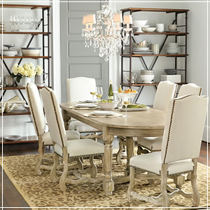 Stacking gorgeous plates on a bookcase is a simple way to turn everyday items into a gorgeous focal point in a formal dining room or breakfast space. We also can’t help but love the way our Toulouse Bookcases packed with pretty dishes gives this chic dining room a more laid-back, inviting vibe. Plus, it sure makes it easy for you to find that serving bowl you’ll need, much easier than digging around in the bowels of some cabinet!