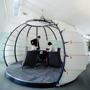 The wall partitions are constructed with two of these panels and are fitted around a steel structure. These partitions are illuminated by fluorescent tubes so that in the evening the meeting rooms resemble a light box with a futuristic feel. A pumpkin shaped brainstorming room on the second floor is meant to encourage the collaboration and creative thinking of our designers.