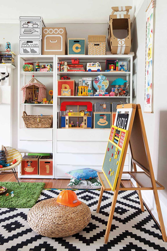 Designate a corner for play by anchoring the space with bookshelves offering plenty of pretty storage of games, toys, and fun boxes of activities.3. KEEP IT SIMPLE