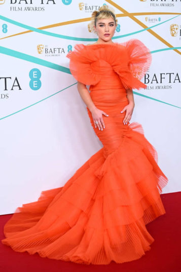 Striking gowns, of course, made up a large portion of the assortment. But these weren’t traditional dresses; Their silhouettes were fresh and innovative. Sheila Atim’s strapless Prada gown, with matching gloves, had a crinkled silver finish; Florence Pugh’s frothy orange tulle dress, by Nina Ricci, also turned heads with its extreme volume.