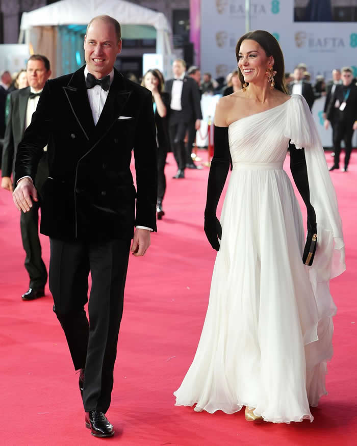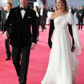 Of course, nobody commanded more attention than Kate Middleton, the Princess of Wales, when she arrived in a white, one-shouldered Alexander McQueen gown. The royal paired it with black opera gloves and affordable Zara earrings (she’s always known for mixing high and low).