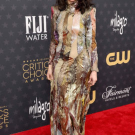 The style highlights of the night came courtesy of the Critics Choice’s best actor front runners. Michelle Yeah stunned in a black and pink Carolina Herrera ensemble that had a pink ruffled shawl, which grazed the floor behind her.