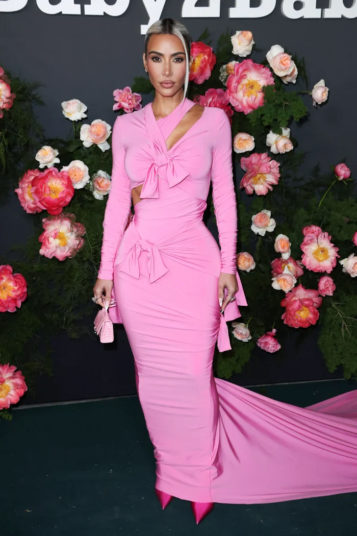 The floor-length number featured a figure-hugging construction and cutouts that were finalized with dainty bows. The reality star paired the vibrant frock with fuchsia boots and a micro Hourglass bag by the fashion house. For her glam, Kardashian opted for soft makeup and a sleek updo.
