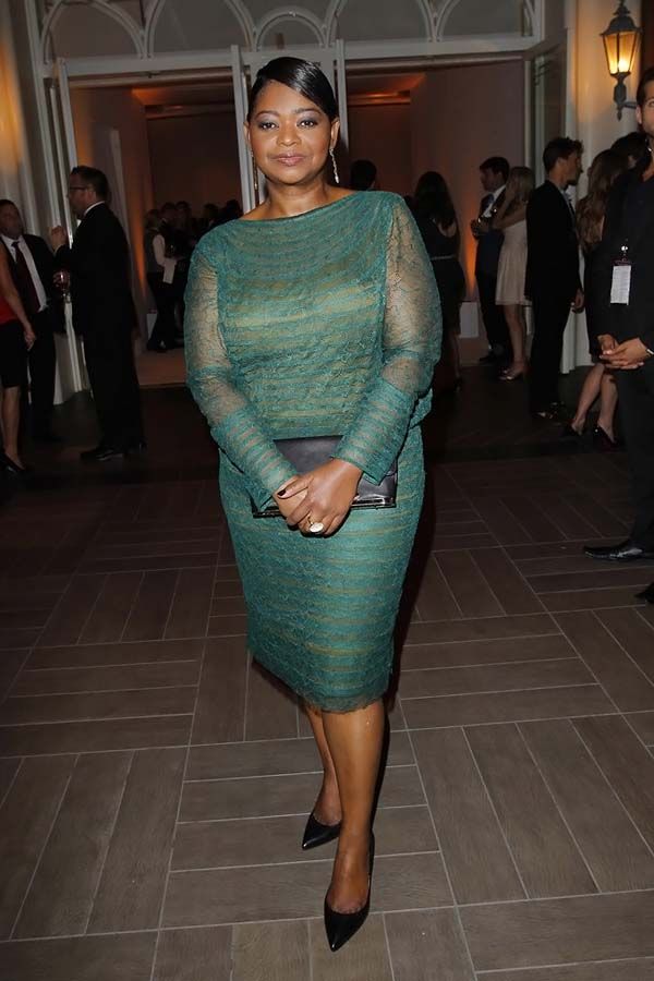 Host Joel McHale, who was game to meet the comedic standard set by past host Alec Baldwin, got the evening rolling with jokes about the all-white decor in the Four Seasons Beverly Hills ballroom. “With all the red wine already spilled, you have no idea how much club soda it takes to keep this place clean,” he said, referring perhaps to the giant red splotch that was quickly removed between his table and the one seating Spencer, Emma Stone, Allison Janney, Viola Davis and Ahna O’Reilly. Testing the audience’s limits, he added, “These chairs are so white some of them have already voted for Mitt Romney.”