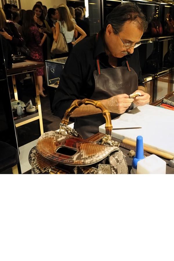 “It really is quite a craft,” Helen Schifter said, taking in the blow-by-blow. “It certainly takes patience.” She wasn’t kidding. Each Jackie, Bamboo and Stirrup bag requires between seven and 13 hours to complete by hand. The New Bamboo, which one technician was fashioning in a hand-painted python, is hand-assembled from 140 components.
