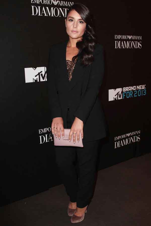 Source: Jasmine Guinness in a bomber jacket and two-tone trousers at the Mulberry party
