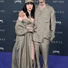 Wilde’s stylist Karla Welch teamed the purple and silver chevron gown with opera gloves—red latex, to match the strappy crimson heel peeking out from under her skirt. Billie Eilish, on the other hand, had a Cleopatra moment, rolling herself and The Neighbourhood’s Jesse Rutherford up in a monogram carpet, with sleepwear underneath—slippers included.