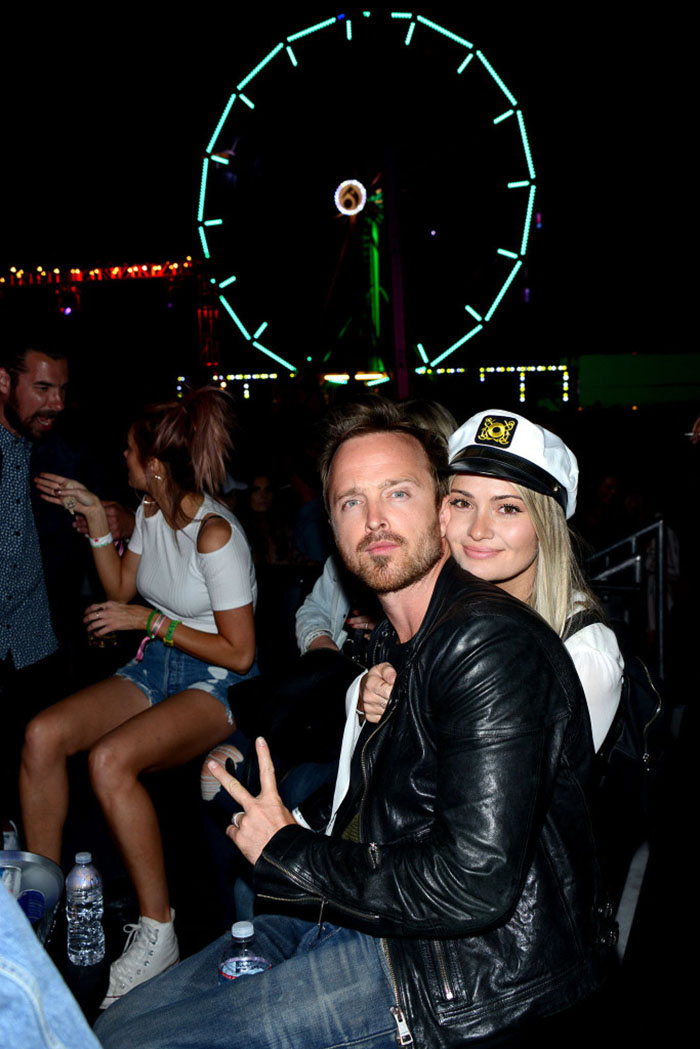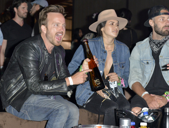 Partygoers including Aaron Paul (one of the first arrivals of the night with his wife, Lauren), Scott Eastwood and James Franco, who all politely declined requests to be interviewed or photographed, took in the scene from their perch in the star-packed VIP bleachers, rubbing shoulders with the likes of former Coachella headliner Drake, who made an appearance after midnight with his entourage following a surprise performance with Future earlier that day.