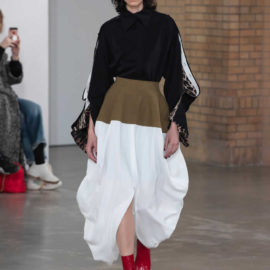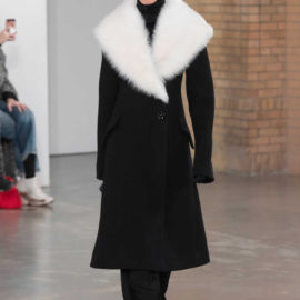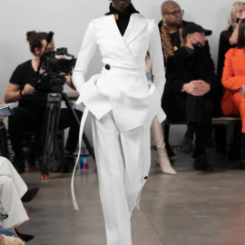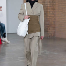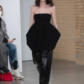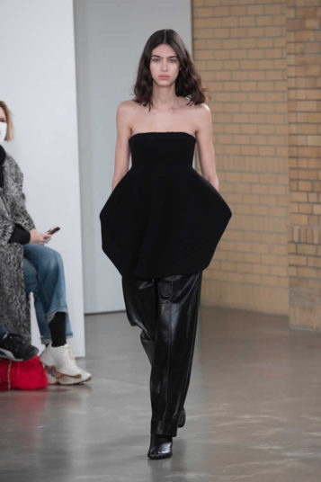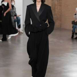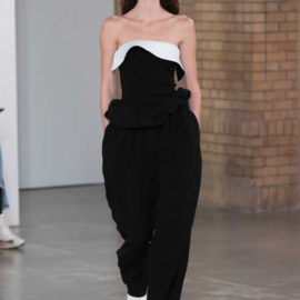 Can a strapless dress with volume evocative of 18th-century panniers really feel effortless? Yes, if it’s in sculpted knitwear with a circular bias-cut skirt. Hernandez and McCollough gave their tailoring the same waisted look by accessorizing suits with torso-spanning body shapers, or by cutting jackets and coats to wrap across the midriff and button off to the side, the cloth equivalent of a firm hug.