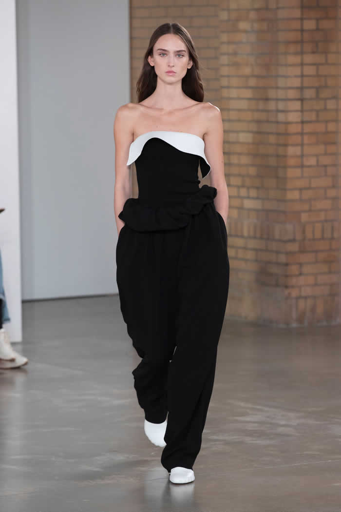 Can a strapless dress with volume evocative of 18th-century panniers really feel effortless? Yes, if it’s in sculpted knitwear with a circular bias-cut skirt. Hernandez and McCollough gave their tailoring the same waisted look by accessorizing suits with torso-spanning body shapers, or by cutting jackets and coats to wrap across the midriff and button off to the side, the cloth equivalent of a firm hug.