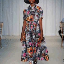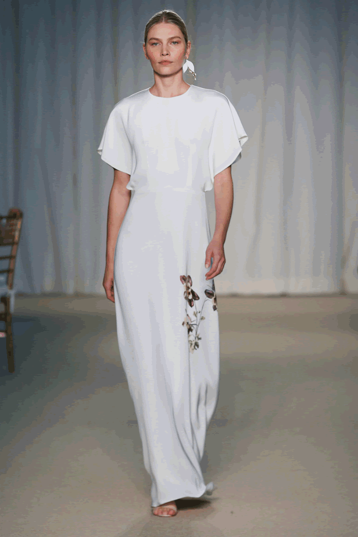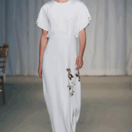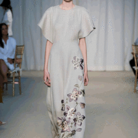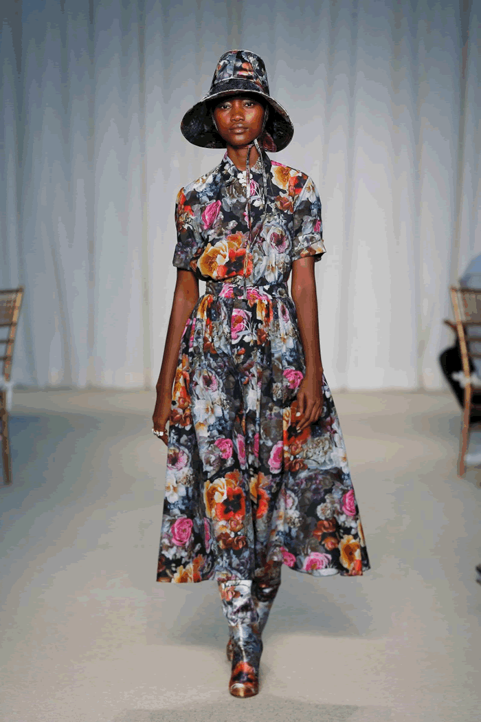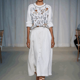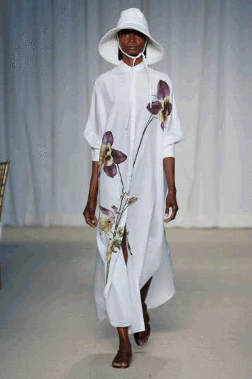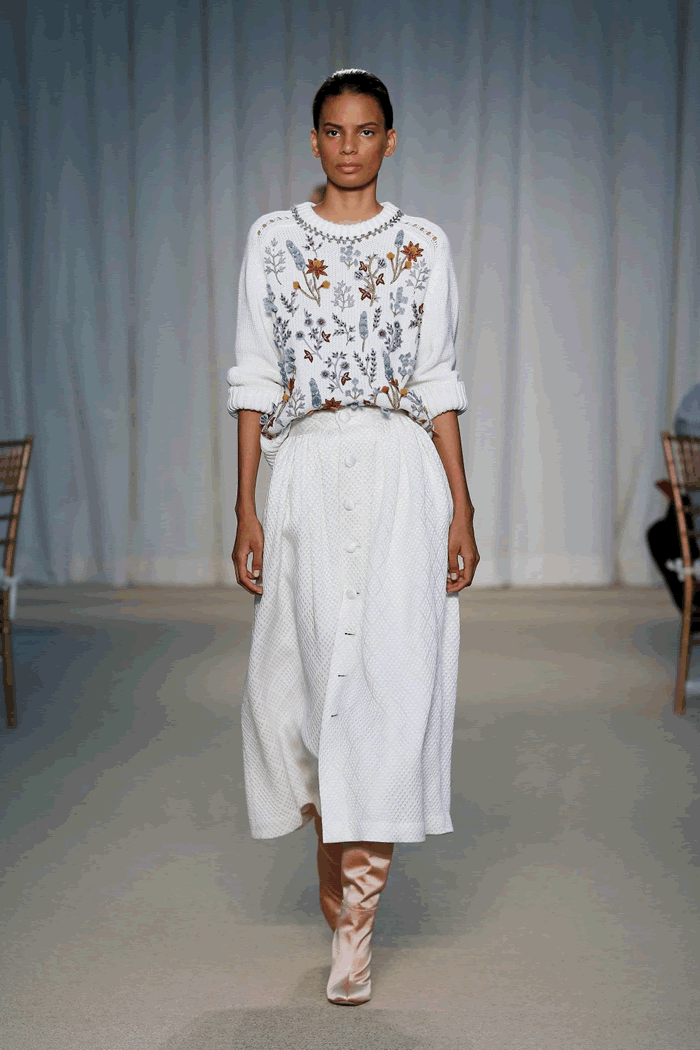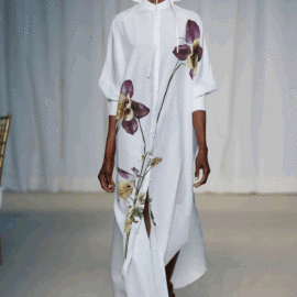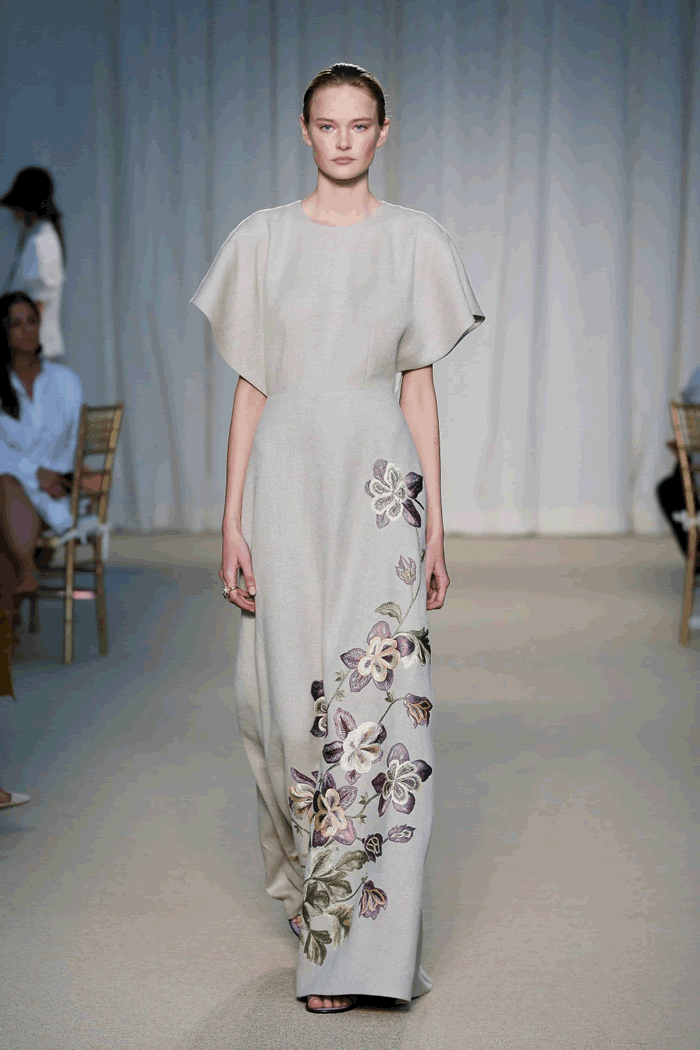 Quilted silk wool added a rich texture to a cream circle skirt, worn with an ivory cotton embroidered sweater after Sadi’s candied blooms. Her moody floral photography was also translated into a print on silk Duchesse pieces. Another nod to the Netherlands? A cream linen gown embroidered with a bouquet and Delft vase after the sculptor’s personal collection.