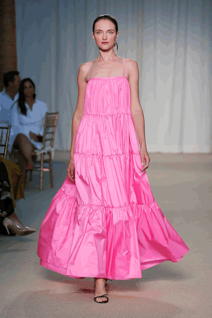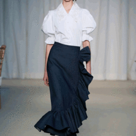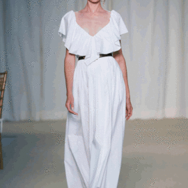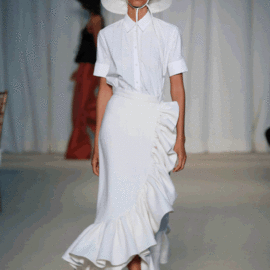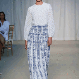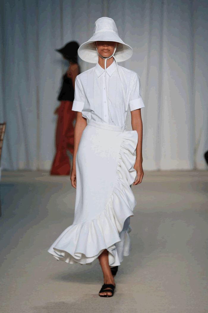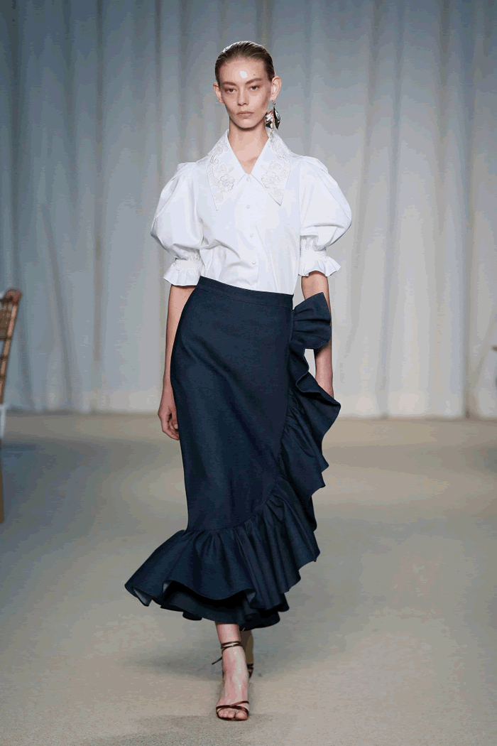 Nobody can get enough special denim right now, and Lippes delivered in that department with a charming railroad stripe cami and patch pants look, as well as a true blue ruffle party skirt that looked great with a white poplin puff-sleeved shirt with lace point collar.